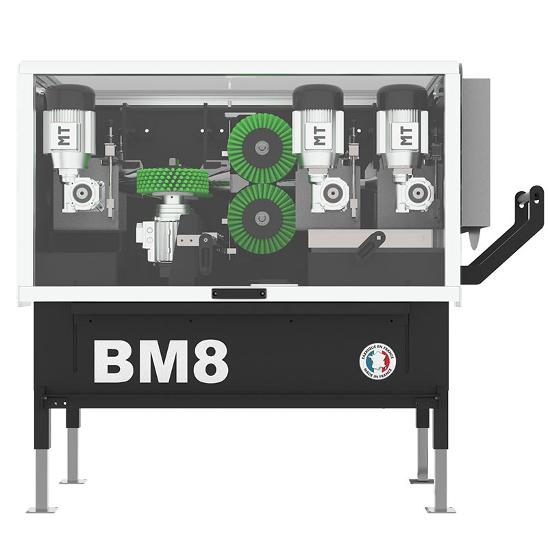 - 2 módulos de cepillos montados a 90° y equipados con motores de velocidad variable limpian las estacas para garantizar la eliminación de todos los brotes